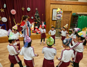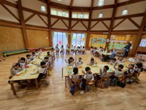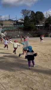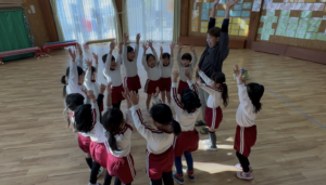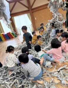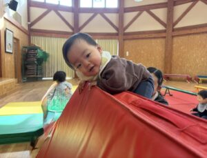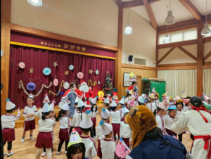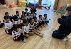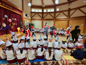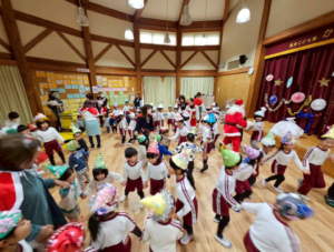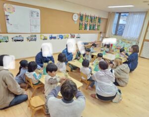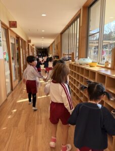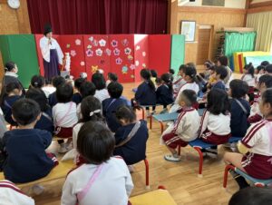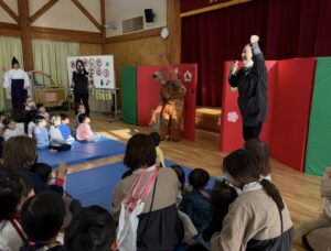 今日は新年お楽しみ会♡ 幼児組は縦割りチームで移動するよ! まずはホールに集まって、『十二支のお話』をきくよ。 今年は・・・午年(うまどし) なんと、ホールにも馬さんが遊びに来てくれました。 みんな登場したときはびっくりしていたけど、興味津々な子どもたち。