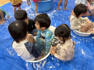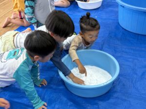 2歳から5歳までのおともだちで、かたくり粉あそびをしました。 乳幼児期のこどもにとって、五感を使った感覚あそびはとても重要だと言われています。 中でもかたくり粉を使った遊びは、こどもが夢中になれる感覚あそびの一つです。 思いっきりかたくり粉で今日は遊びます。 最初はサラサラの粉のかたくり粉。 少しずつ水を入れてみると・・・