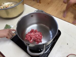 お肉をお鍋に入れると、 「じゅーーっって音がする!!」 「おいしそうなにおいがしてきたーーー!」 と嬉しそうな子どもたち!