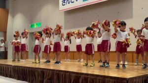川尻町で行われる、『喜楽会』に年中ひまわりぐみが参加しました。 みんなの大好きな【ドラえもんの歌】の曲に合わせてダンスをしたよ♪ 出番まで待っている間はドキドキの子どもたち。