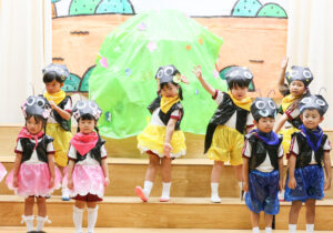 歌は『あおいそらにえをこう♪』 歌の途中にある「えいやっ」のかけ声も、かっこよく言えました! 次は、みんなで小道具・大道具など製作したものを使って劇遊び『ありんこのアリー』を演じてくれます。 舞台袖で待っている時は、ドキドキする~💦といっていた子どもたちでしたが、舞台に上がるといつもの様子で楽しそうに演じてくれました。