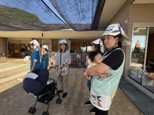 屋根のあるところでみんなで輪になっていただきました。 「みてみて~!これおいしいんよ!」 「おいしーい❤」 とってもおいしそうに食べていました。天気はあいにくだったけど普段と違う場所でお家の方に作ってもらったお弁当を食べて、大満足の子どもたち(⌒∇⌒)