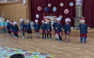 みんなが楽しみにしていたクリスマス会! ホールにみんなが作ったとっておきの、クリスマス三角帽子をかぶって集まるよ!