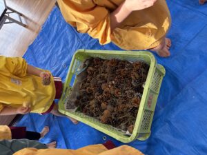 造形教室で『クリスマスツリー』をつくります! 岩本先生が持って来てくれた、立体の星とたくさんのまつぼっくりを使って飾りをつけていくよ!