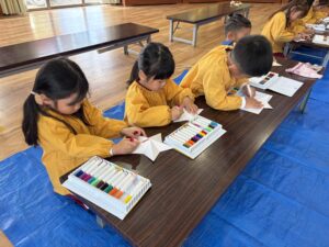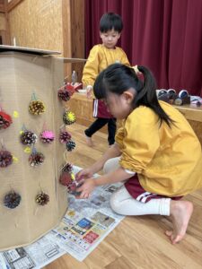 ゴムで縛っていたところが模様になってとってもかわいいね♡ できた作品は卒園式の時に持ち帰る予定です! おたのしみに(o^―^o)