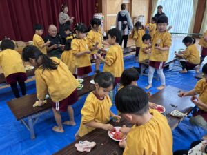 みんなの力強い掛け声にパワーをもらい、ペったんぺったん・・・ つき終わると、おいしそうなおもちの出来上がり!!
