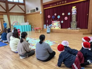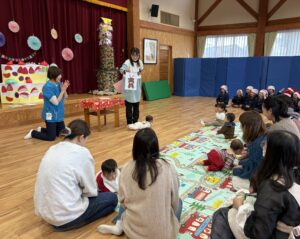 こども園かがやきでは、子育て支援で毎月一回『かがやきひろば』があります。 今月は、『ミニミニクリスマス会』🎅 クリスマスの絵本を見たり、
