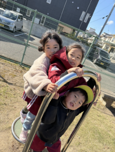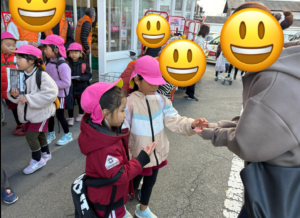 先に来ていた、たんぽぽ・ひまわりぐみのおともだちと合流して遊ぶよ! 寒い日だったけど、元気いっぱい走り回り広い公園で楽しく遊んだ子どもたち。 帰り道、警察の方とのお約束を守って気を付けて帰りました。