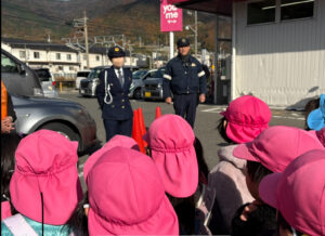 ばらぐみが、川尻町内にあるスーパーで、『年末交通安全運動』を行いました。 老人会の方や警察の方と一緒に、「車の運転、気を付けてください」など声をかけながら、老人会の方が作られたプレゼントを渡しました。