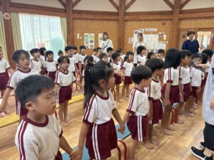 最後のプールを思いっきり楽しめるように、体操してしっかり体を動かすよ~ きょうの体操は、まもるんじゃ―と一緒《エビカニクス》!! Let’s go!!