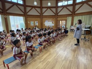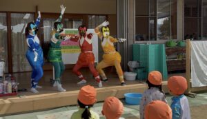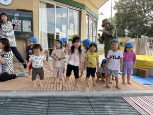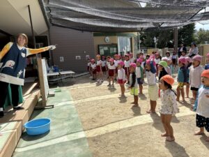 たのしかったプールも今日でおしまいです。 最後の日をしっかり楽しもう!! 『プールおさめ』の会がありました。 プール開きの日にも来てくれた、【プールの安全まもるんじゃ―】の4人!!(前より2人ふえてる😲) みんなの歓声をうけての登場です(笑)
