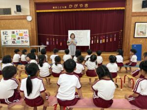 こども園かがやきの3つのお約束。 1,せんそう、げんばくはいやだ! 2,いやなことはいやといおう! 3、ひとのいのちも、じぶんのいのちもたいせつにしよう!