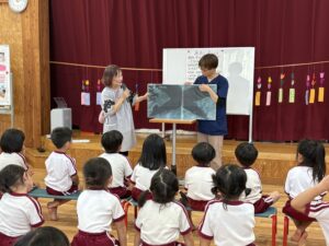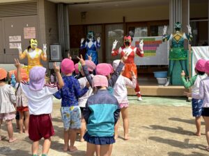 たのしかったプールも今日でおしまいです。 最後の日をしっかり楽しもう!! 『プールおさめ』の会がありました。 プール開きの日にも来てくれた、【プールの安全まもるんじゃ―】の4人!!(前より2人ふえてる😲) みんなの歓声をうけての登場です(笑)