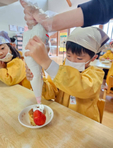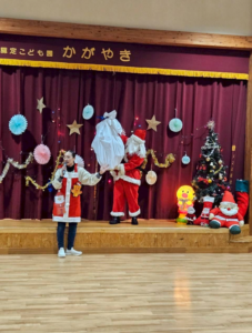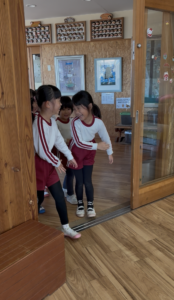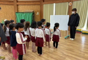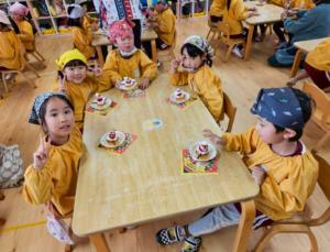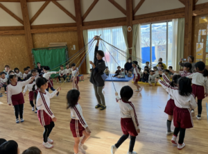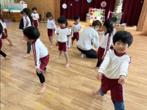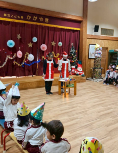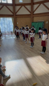 今日は新年お楽しみ会♡ 幼児組は縦割りチームで移動するよ! まずはホールに集まって、『十二支のお話』をきくよ。 今年は・・・午年(うまどし) なんと、ホールにも馬さんが遊びに来てくれました。 みんな登場したときはびっくりしていたけど、興味津々な子どもたち。